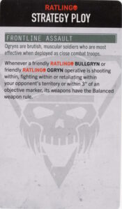 - Frontline Assault: El ploy para nuestros amigos grandes Ogryn y Bullgryn. Si se encuentran shooting, fighting o retaleating a 3″ o menos, sus armas obtienen balanced, bastante bien en general.