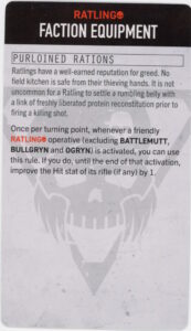 - Purloined Rations: Otro gran equipo. Mejorar los hit stats de 3+ de algún operativo clave siempre será bienvenido, asegurar daño y ataque es lo que buscamos siempre. Tanto este equipo como Lucky round son obligatorios.