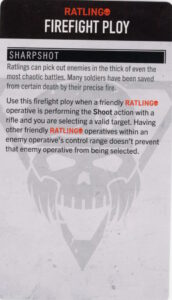 - Crack Shots: Disparar a un enemigo a más de 6″ en una activación donde nuestro Ratling no se ha movido nos brinda Balanced bastante bueno en general. Tal vez para un Turning point 2 o 3, donde nuestros Ratlings han logrado posicionarse bien, este sería un buen ploy en general.