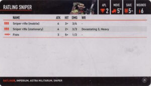 - Sniper Positions: Si tienes heavy terrain en rango de control y el operativo se encuentra a más de 6″ del enemigo. Su perfil del rifle obtiene SILENT así es, tenemos un ploy que permitiría a nuestros Ratlings disparar sin ser disparados de regreso. Una interesante alternativa para un scouting de ploy gratis o por supuesto, unos buenos 2 primers Turning Points para hacer daño y sentirse a salvo.